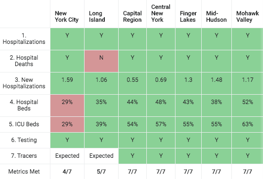 纽约市长白思豪(Bill de Blasio)和纽约州州长科莫都表示,纽约市目前有望在6月的第一周或第二周重新开放。有三个标准挡住了它的去路:只需要比目前的可用医院床位和重症监护病房(29%)再增加1%,就能达到科莫提出的30%的开放门槛,以确保潜在的复发不会再次压倒整个系统;还需要满足接触追踪目标,不过在其他9个已经或准备重新开放的地区,这是最后一个确定的目标——通常是在重新开放后的24小时内。