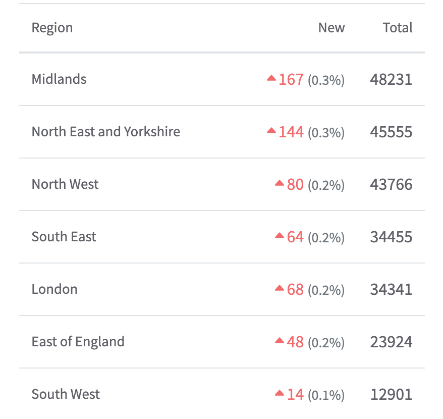 过去24小时,英格兰地区单日新增确诊排名前三:Leicester(+43);Bradford(+33);Northamptionshire(+29)