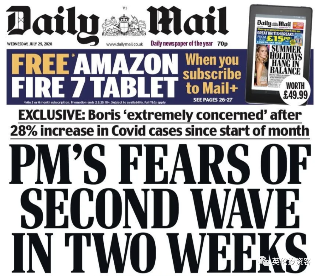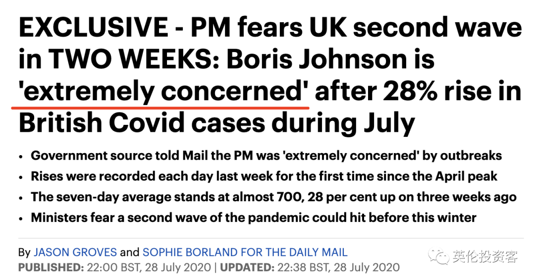 报道透露,虽然目前英国每天的新增感染仍处于较低水平,约为日均700左右,但对比三周前日均530有所增加,增加了约28%。鲍里斯周二在到访诺丁汉时,也警告英国人不要对疫情掉以轻心,并称欧洲疫情已经出现了二次疫情爆发的迹象,英国应警惕境外输入。鲍里斯最新讲话:欧洲正面临疫情二次爆发,我们会快速隔离传染率上升的国家对于首相的担忧和预警,《每日邮报》也将其放上周三头版,提醒大家接下来两周非常关键。