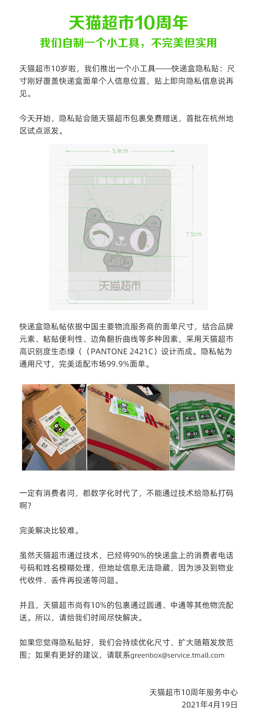天猫超市推出快递盒隐私贴:防个人信息“裸奔”,欢迎提供更好的保护方案