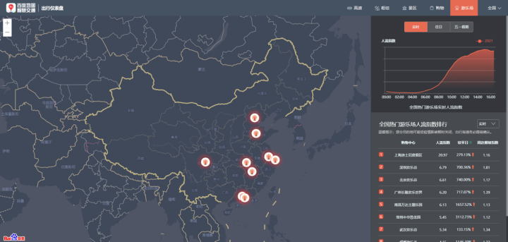(截至5月1日16:30 百度地图出行仪表盘全国热门游乐场人流量)