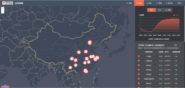 (截至5月1日16:30 百度地图出行仪表盘全国交通枢纽人流量)