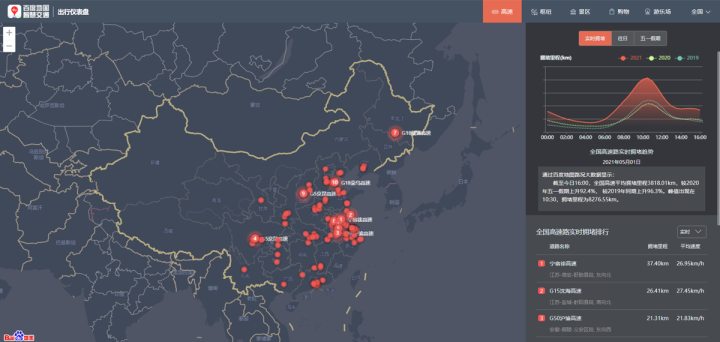 (截至5月1日16:30 百度地图出行仪表盘全国高速拥堵情况)