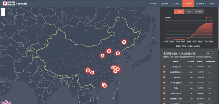 (截至5月1日16:30 百度地图出行仪表盘全国购物中心人流量)