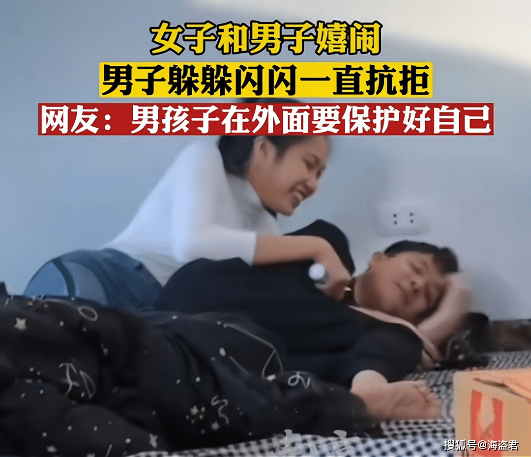 女子想让男生陪她玩,可男生不愿意起床,于是女子便爬到床上想把男生给强行拖起来。女生的力气没有男生大,根本就拖不动男生,拉拉扯扯之间,女子忘记了保持自己的形象。