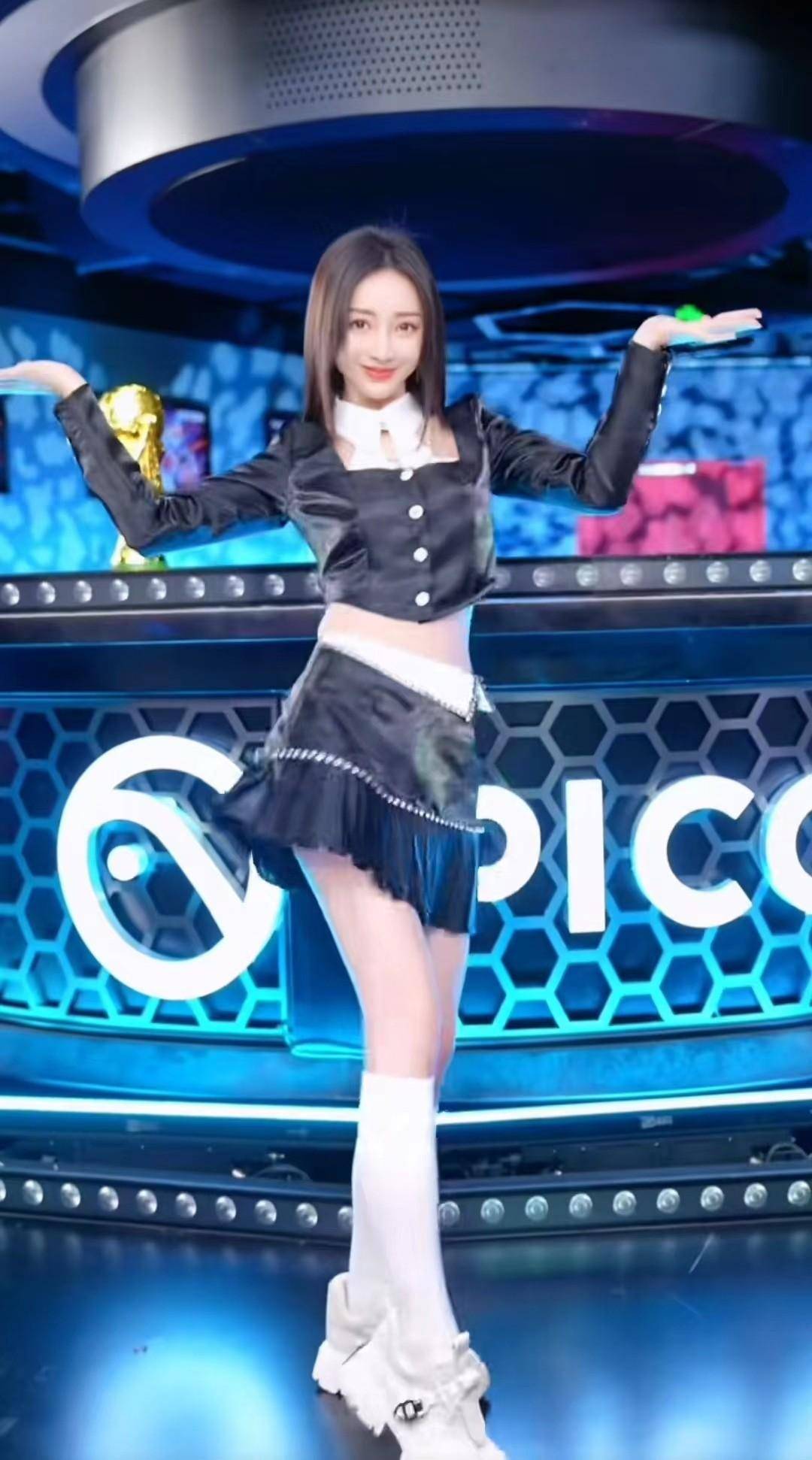 画面中,柳岩身穿一件黑色镂空皮质短款上衣,下身穿着黑色皮质短裙,脚踩白色运动鞋,搭配一双白色长袜,再加上一双白皙又修长的美腿,着实是美到犯规。