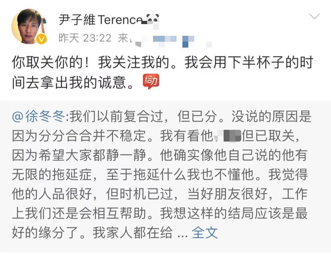 没多久,徐冬冬又发了一条动态,解释了两人感情上的问题,不否认尹子维曾对自己很呵护,但两人之间存在着很大的问题,尤其是在人生的规划根本就沟通不了,希望他不要再纠缠自己。