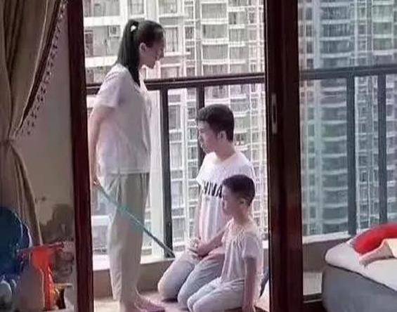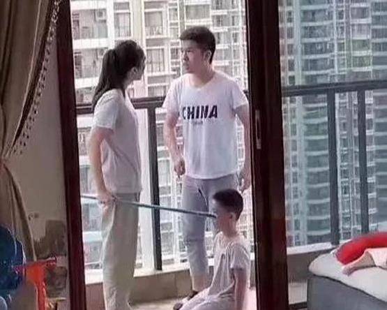 第一张照片,只见一对夫妻站在阳台上似乎在争吵什么,丈夫眼睛瞪得圆圆的,一副理直气壮的架势。而妻子右手拎着一根棍子,歪着头正和丈夫理论,隔着屏幕都能感觉到一股浓浓的火药味。旁边的儿子乖乖地跪在地上。