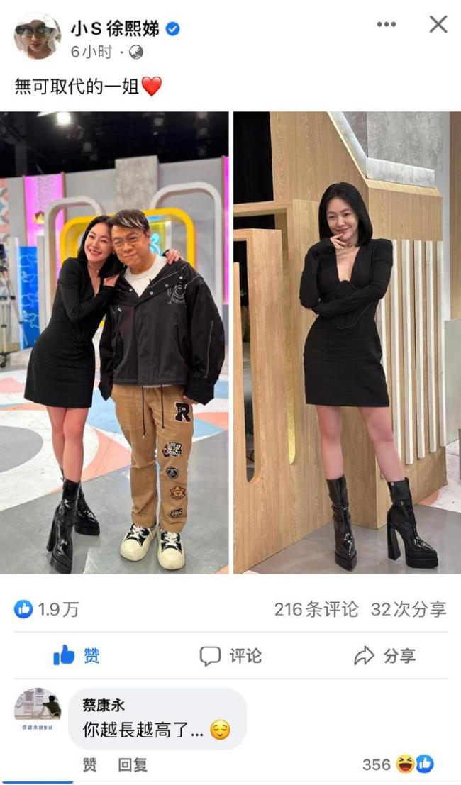23日,小s在个人社交平台分享了与蔡康永的合影,并配文:“无可取代的一姐。”蔡康永则在帖子下评论:“你越长越高了。”