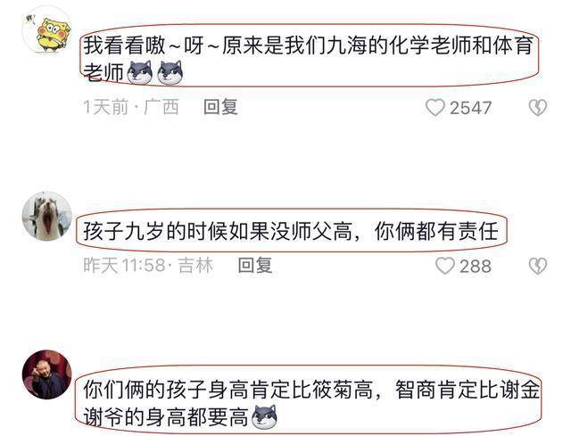 有小伙伴看到张小白和杨毅的互动,直接说,这不是关九海的化学老师和体育老师吗?还有人想着以后的事,说等孩子九岁了,就没有老爷子高了,你们两个都要负责。