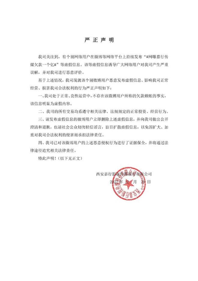 12月29日,嘉行传媒发声明,否认欠款一个亿。称:我司处于正常、良性运营中,不存在该用户所说的欠款赖账的事实,该信息明显为虚假内容。