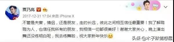 这就是这个事件中最大的受害者贾乃亮发出来的声明。字里行间看到的是有担当的男人的用情之深。在这样的事件发生后,他还称呼李小璐为“璐璐”,为李小璐出轨事件把责任全背到了自己身上,认为自己在工作和家庭中没有找到平衡,陪伴家人的时间太短。