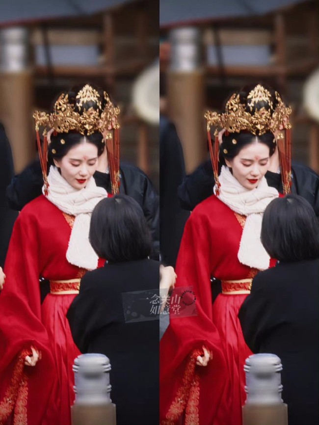 刘诗诗一念关山大婚造型路透 红衣金饰显华丽
