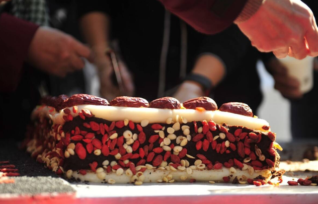 其实,切糕大部分都是用糯米、水果、干果混合制作而成,食材方面并不是太贵。但对于切糕老板来说,切糕的制作过程很复杂,制作一大块切糕就要一两天的时间。