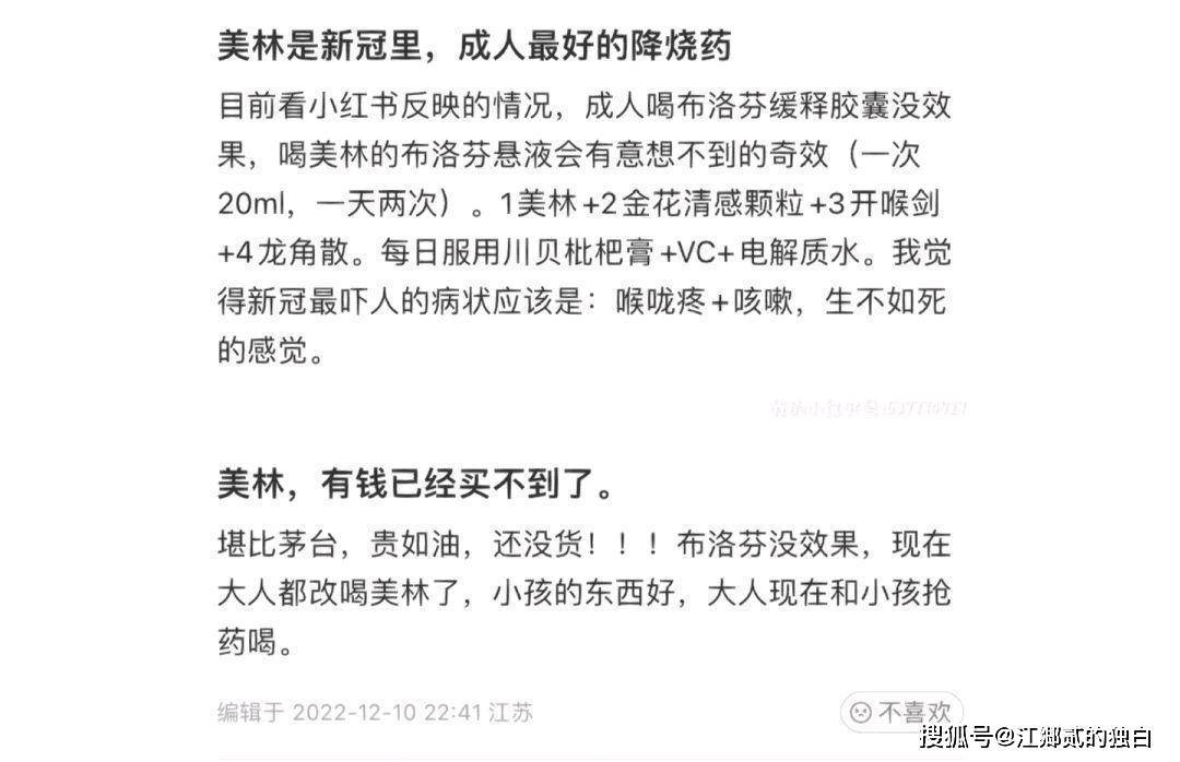 要说12月份的舆论焦点,不外乎是退烧药品和阳性感染后的症状,在某书上,来自江苏的网友分享了“美林是新冠里,成人最好的药”一篇小作文,在文中提到了阳性感染后的症状为喉咙疼和咳嗽,生不如死,示意让其他人尝试使用美林的儿童退烧药。