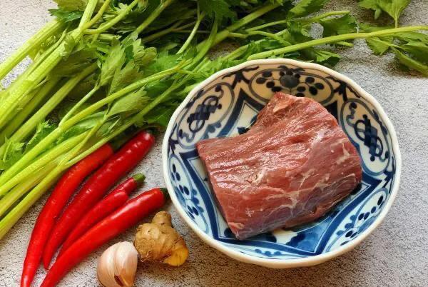 1.首先准备山芹一小把去掉,叶子。然后切成三厘米左右的小段放入碗中备用。牛肉500克切成厚厚的薄片,然后再切成细丝。在里面加入葱姜、精盐、料酒、生抽、老抽用手抓拌均匀,腌制一会儿。