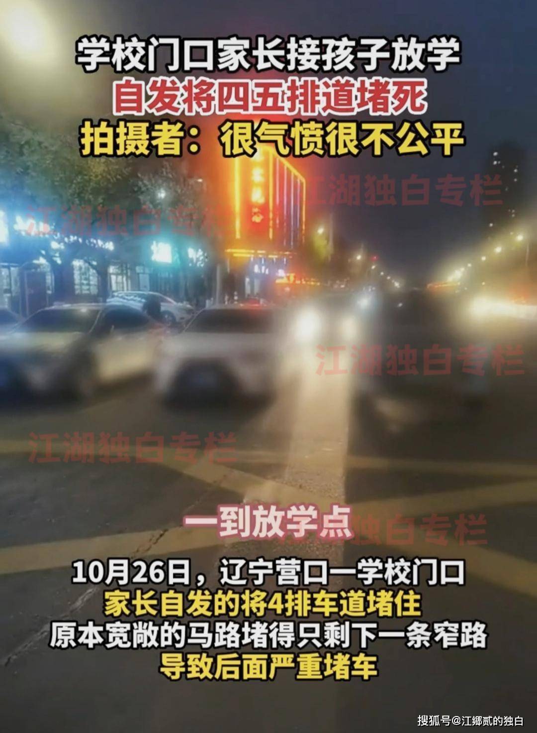 10月26号,有一名网友在社交平台上曝光了校门口堵塞的情况,在辽宁营口一学校门口,家长将4排车道堵住,导致原有的车道无法通行,造成严重的堵车。