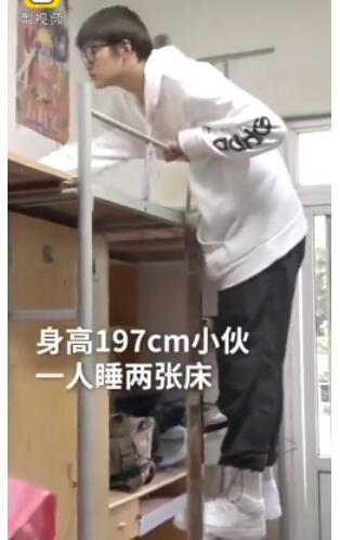 夏同学表示,因为自己身高的关系,高中时因为寝室里的床放得比较拥挤,他的脚常顶到同学的头或者物品上,非常尴尬,最后只好在校外租房居住。如今来到大学,居然发现寝室的床那么长,终于可以住学校宿舍了,他开心到飞起。