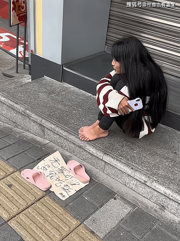 “无家可归,没钱吃饭,谢谢!”一张泛黄的A4纸上写着前言不搭后语的简介,两只脏兮兮的粉色拖鞋尤为突兀。