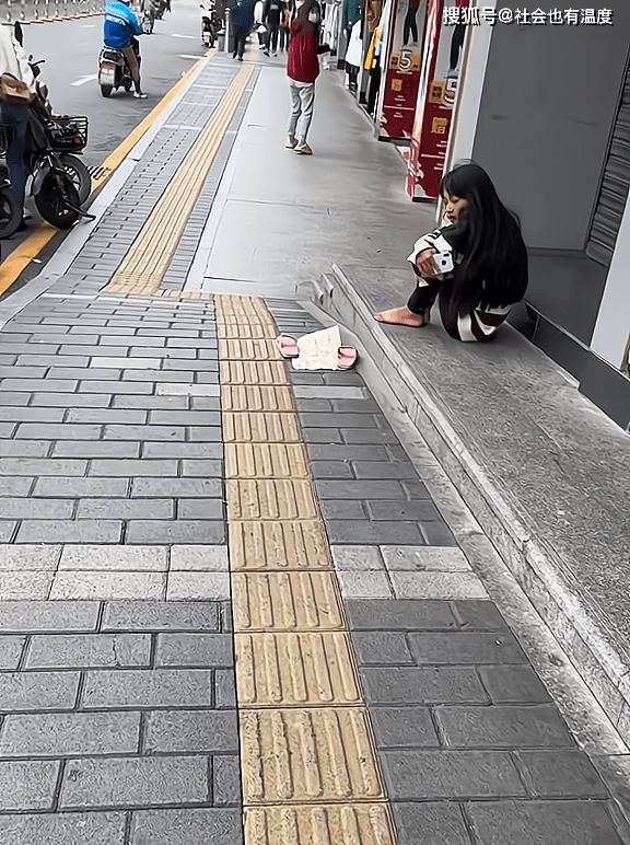 这名女子也下意识地抱紧了膝盖,她能做的只有这么多,正如A4纸上的内容,她无家可归,平时都是靠周边的街坊施舍。