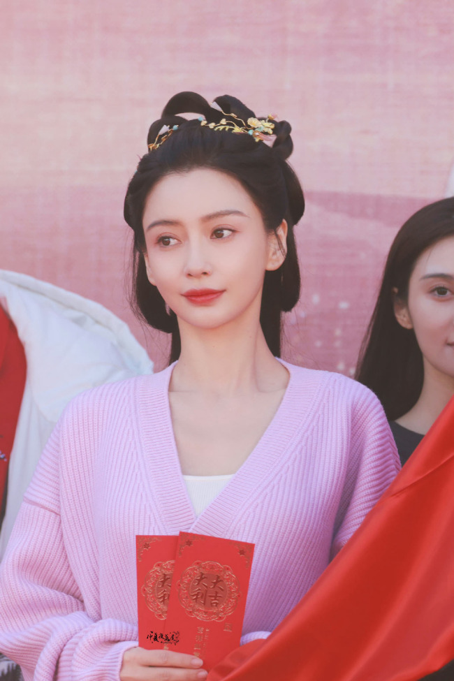 1月31日,Angelababy宋威龙新剧《相思令》开机。baby身穿粉色针织衫,梳戏中发型亮相,变身古装美人。