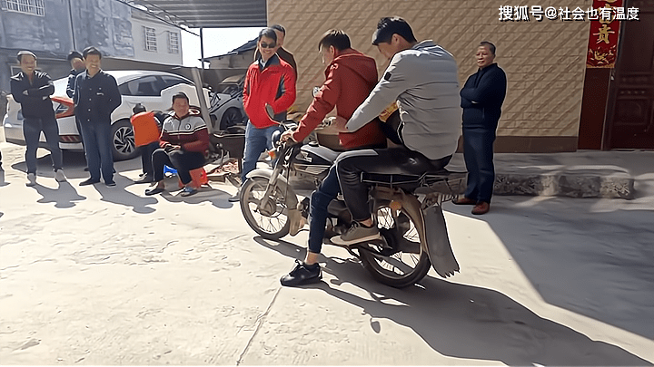 现场又有两个人给大叔送上了“祝福”,大叔没有理会,径直坐上了摩托车……