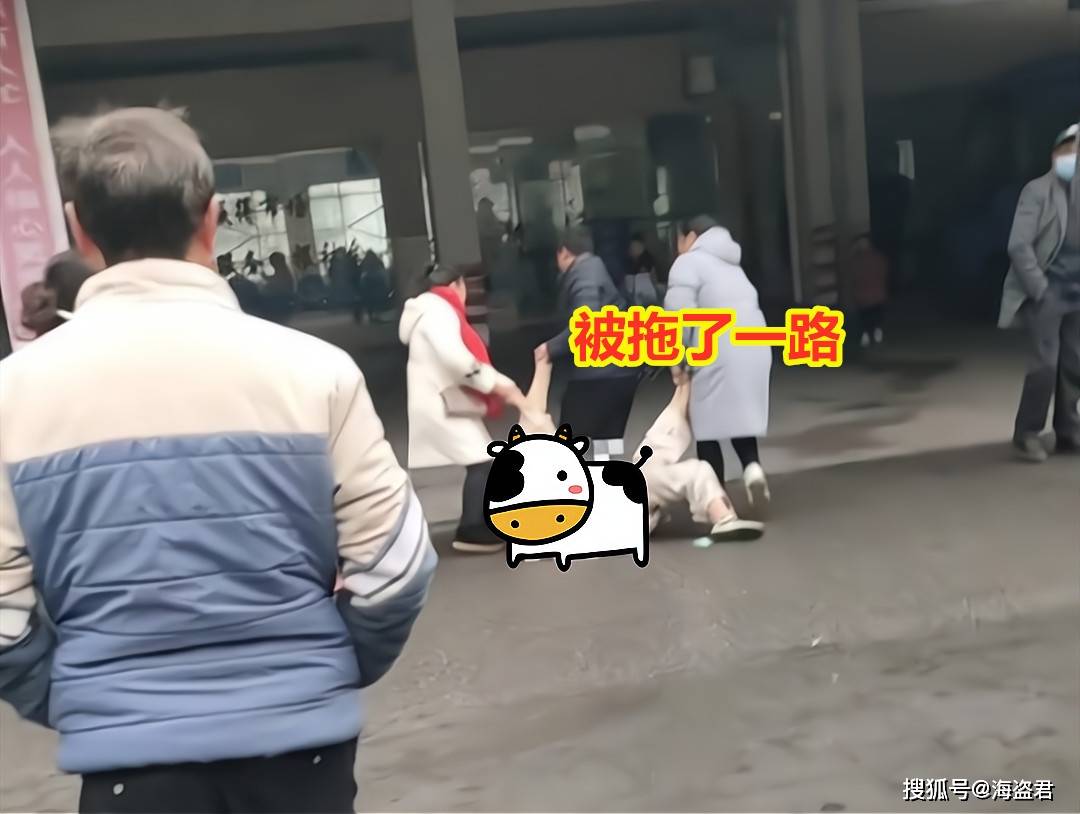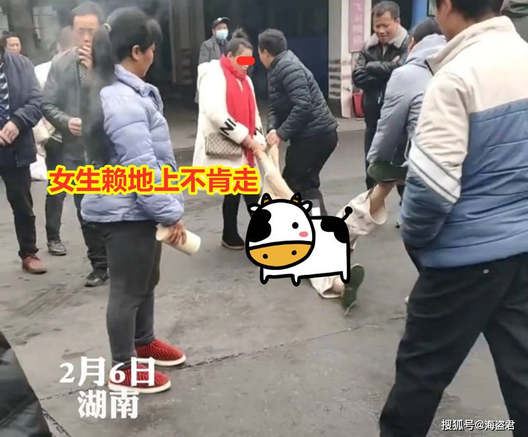 母亲和亲戚见状也上前抓手抬脚,几个人合伙将女生强行往外拖,至此女生还是不愿意服软。