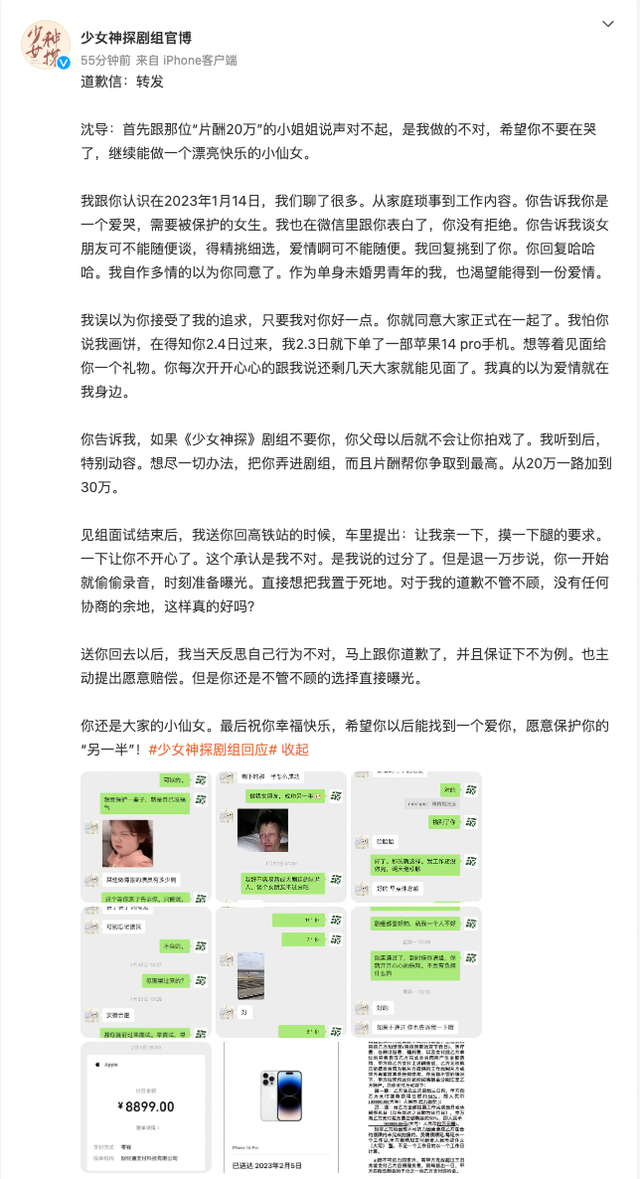 更有意思的在后面,《少女神探》明明刚刚将沈导开除,却转发了他的“道歉信”。
