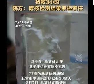 2月11日,黑龙江五常。77岁的马某林因病进入五常市中医院治疗已有20余天。2月7日,马某林在输液时,其家属发现输液瓶内有絮状物。马某林的儿子马先生称,其父亲随后出现高烧及抽搐症状,随后进行了抢救。马先生称当时输液的药品为硝酸异山梨酯,作为治疗心衰的药品给其父亲使用。事发后马先生将含有絮状物的输液瓶进行了保存,他表示希望弄清絮状物的成因。