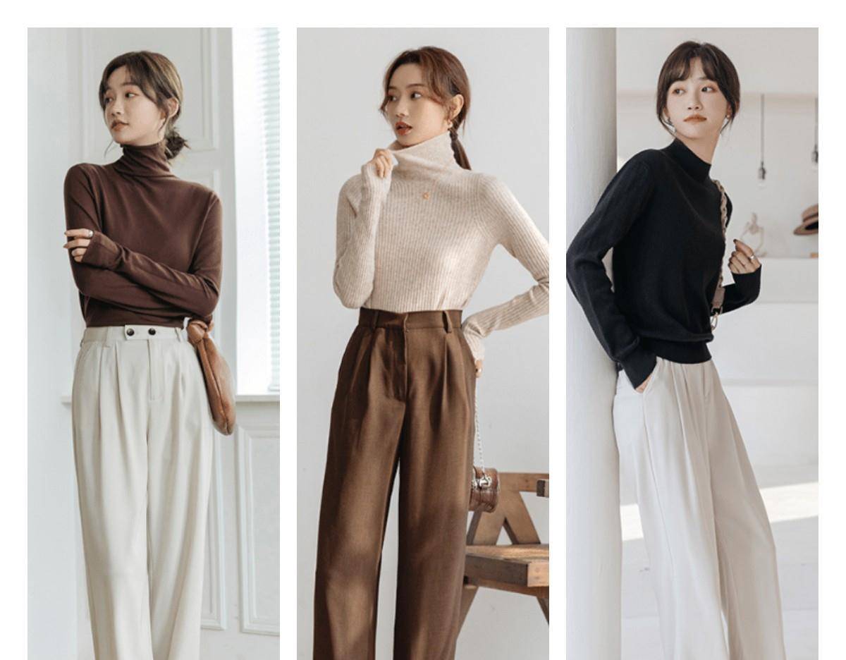 而且高领针织衫本身就有着温柔的特质,与垂顺感较好的阔腿西裤搭配,遮肉显瘦,优雅又文艺,气质感爆棚!小个子女生选择阔腿西裤的时候,尽量选择九分哦,避免邋遢拖地,或者搭配中跟靴,拉长身高还不会累脚,完美~