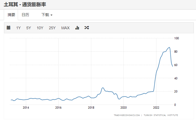 大家来看看,土耳其的通货膨胀率:每年贬值10-20%是常态,不好的年头,一年贬值80-100%也没啥的。你要是持有它的货币,那还真不如持有卢布呢。