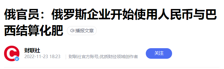比如,2022 年 11 月 23 日,俄罗斯工业家和企业家联合会化肥生产和市场委员会主席德米特里 · 马泽平在向俄罗斯总统普京汇报工作时表示,俄罗斯乌拉尔 URALCHEM 集团开始使用人民币与巴西结算化肥。他表示,由于人民币目前流动性最佳,发展中国家愿意使用人民币支付。