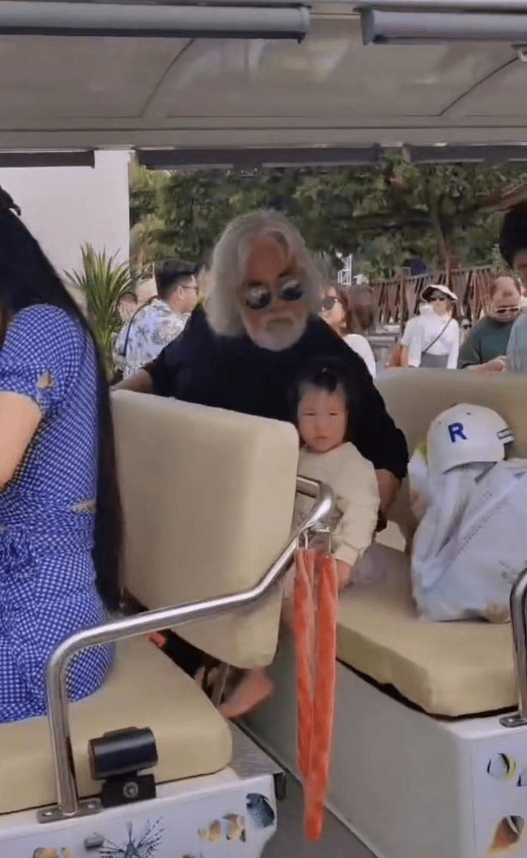 画面中,一家三口毫无架子,坐在旅游观光车上,尽情享受这少有的闲暇时光。