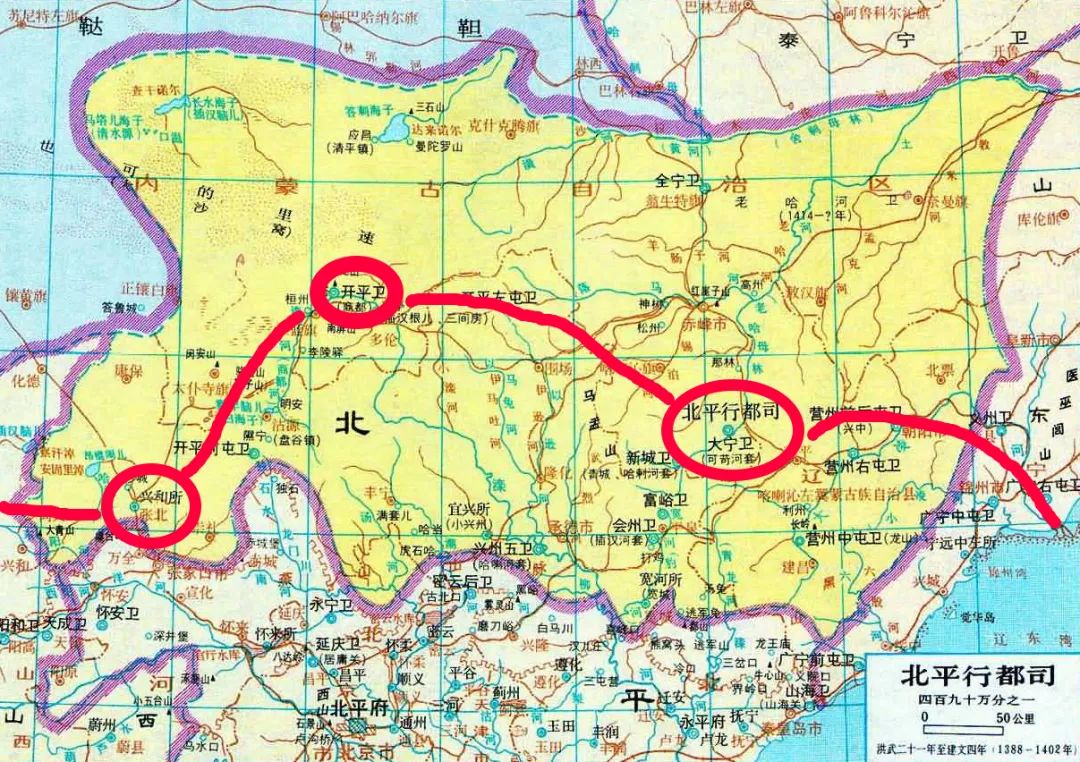 结果靖难之役爆发以后,朱棣到大宁裹挟了宁王,把大宁兵马和朵颜三卫都调走,导致大宁成为一座空城。靖难成功,朱棣论功行赏,又把大宁赏给朵颜三卫,宁王徙封到南昌。没有大宁做犄角,开平卫就有些孤军深入了,朱棣在的时候还能维持,等朱棣驾崩以后,开平卫便支撑不住,1430年内迁到独石城。没有开平和大宁,兴和卫和东胜城也废弃,卫所被迁徙到内地。至此,朱元璋打造的北疆防线崩盘,大明边境退到居庸关、古北口一线。