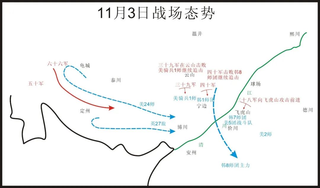 10月27日,韩军第7师团得到命令,填补韩军第8师团离开后的空缺。但到29日,第7师团才集结完部队开始机动,而他们一路上又拖拖拉拉,11月1日,方才赶到价川以北的飞虎山。