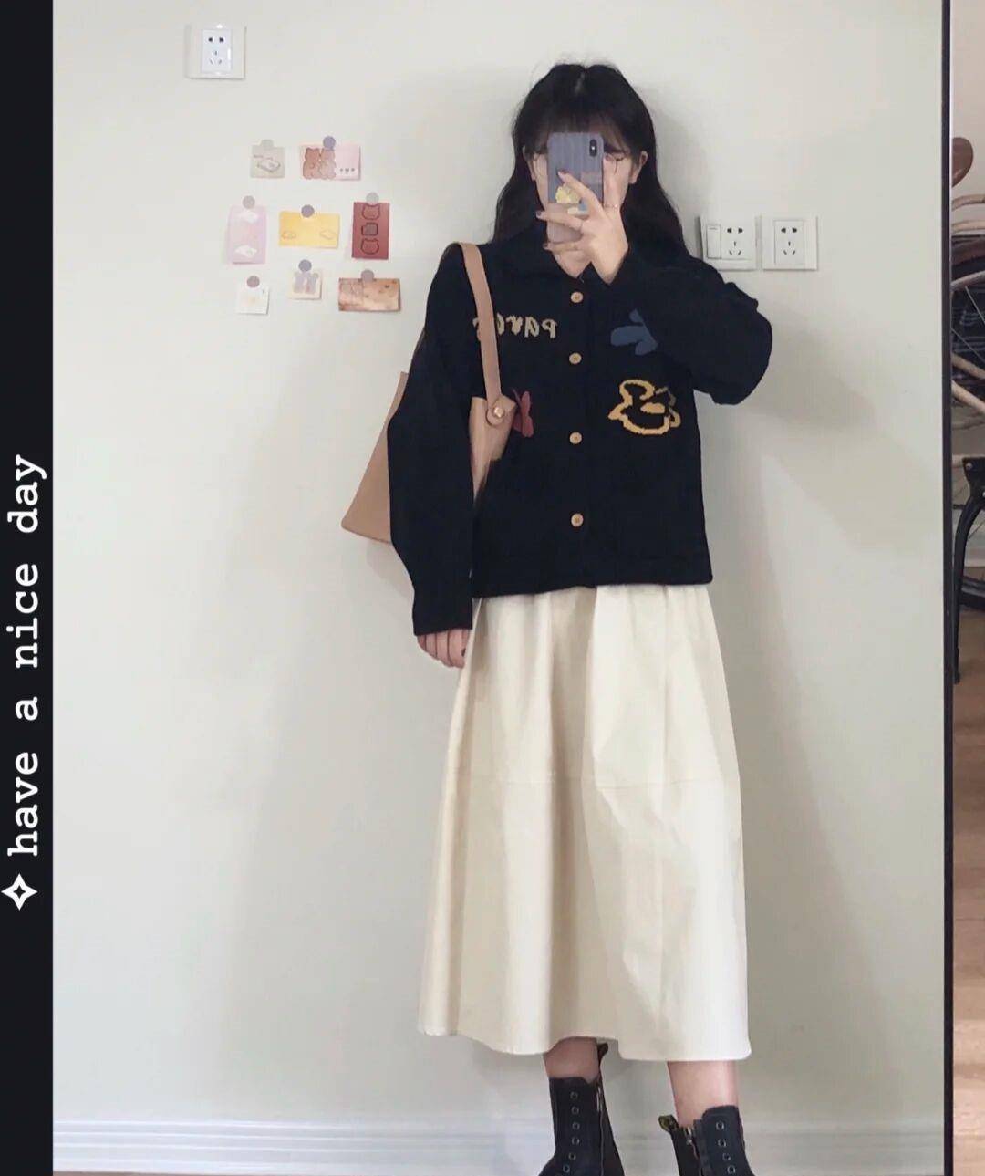 这种米白色针织开衫搭配牛仔裤穿也是非常漂亮的,然后再配一双日系的小皮鞋,看起来非常具有学院风。这件白色针织开衫在穿着的时候可以给它叠穿起来,叠穿一个高领的打底衫,然后再把衣摆塞进裤腰里,营造不规则的感觉,这个米白色的针织开衫是属于比较厚的类型,所以在搭配上我们要选择一个修身的直筒牛仔裤,这样不会显得整个人很臃肿,反而还会显得腿很细。