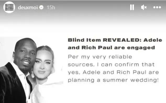2月28日,据外媒报道,阿黛尔与保罗里奇被曝订婚,两人计划在夏天举办婚礼。这一消息是由八卦网站Deuxmoi披露的,该网站称这一消息来自一个“非常可靠的来源”。