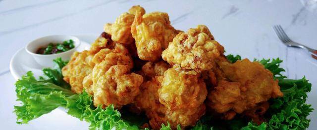8、等所有的菜花都炸好后,就将生菜洗净控干水后,铺在餐盘上,然后将炸过的菜花放到上面,就可以端上餐桌享用了。