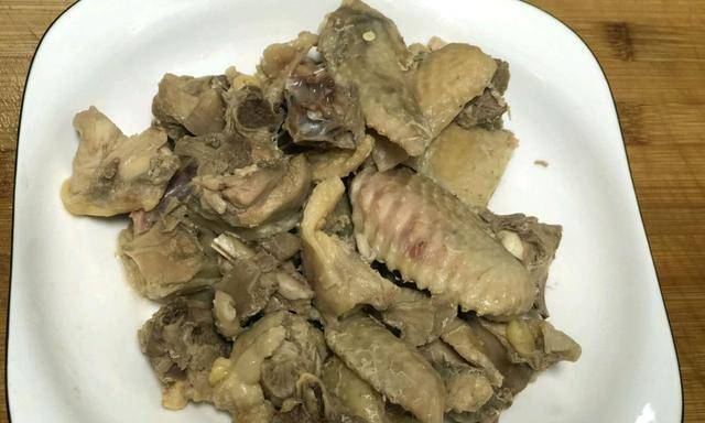 4、焯好的鸡肉块控干水后,去除一些小的碎块和肉末,装盘待用。