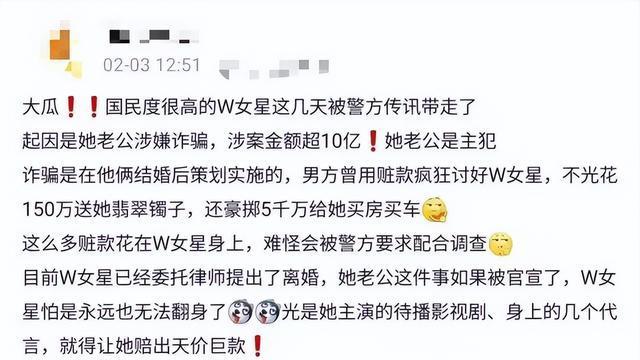 他称W姓女星的老公因为涉嫌房地产诈骗被警方带走了,而在此人追求W女星时出手就相当阔绰,直接给她送价值几百万的跑车。