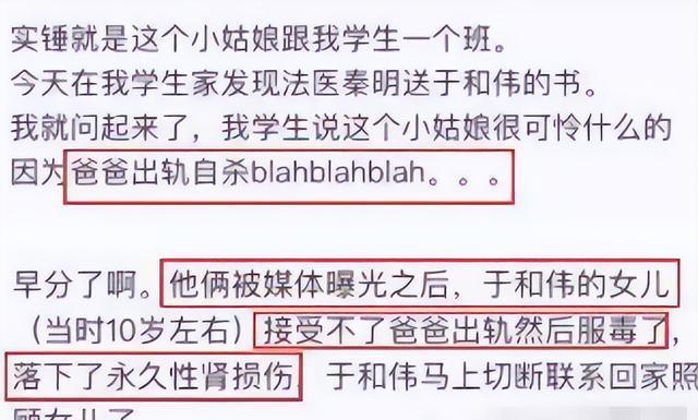 因为接受不了父亲出轨和外界的议论,于和伟年仅十岁的女儿不惜喝下农药想要使父亲醒悟,最终自杀未遂落得永久性衰竭。