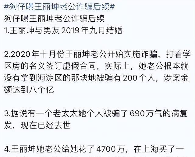 博主发文声称王丽坤的丈夫根本不是从事正经产业的真富豪,而是一个诈骗10亿的诈骗犯,同时还透露她其实也参与了此次诈骗。