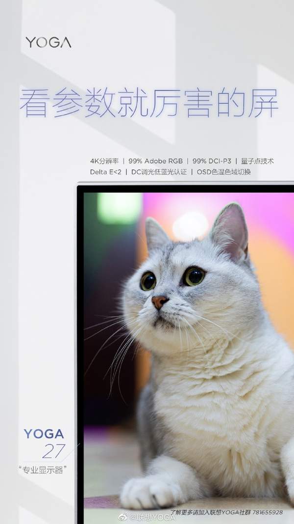 联想表示YOGA 27 “专业显示器”为4K分辨率,99% Adobe RGB 色域,99% DCI-P3色域,ΔE小于2,采用了量子点技术,支持OSD色温色域切换。