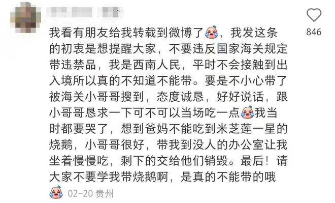 因不想浪费全部的烧鹅,所以该网友询问海关「可不可以当场吃一点」。最终海关带他到没人的办公室,让他坐在里面「啃甘牌烧鹅」,而剩下的则帮他销毁。