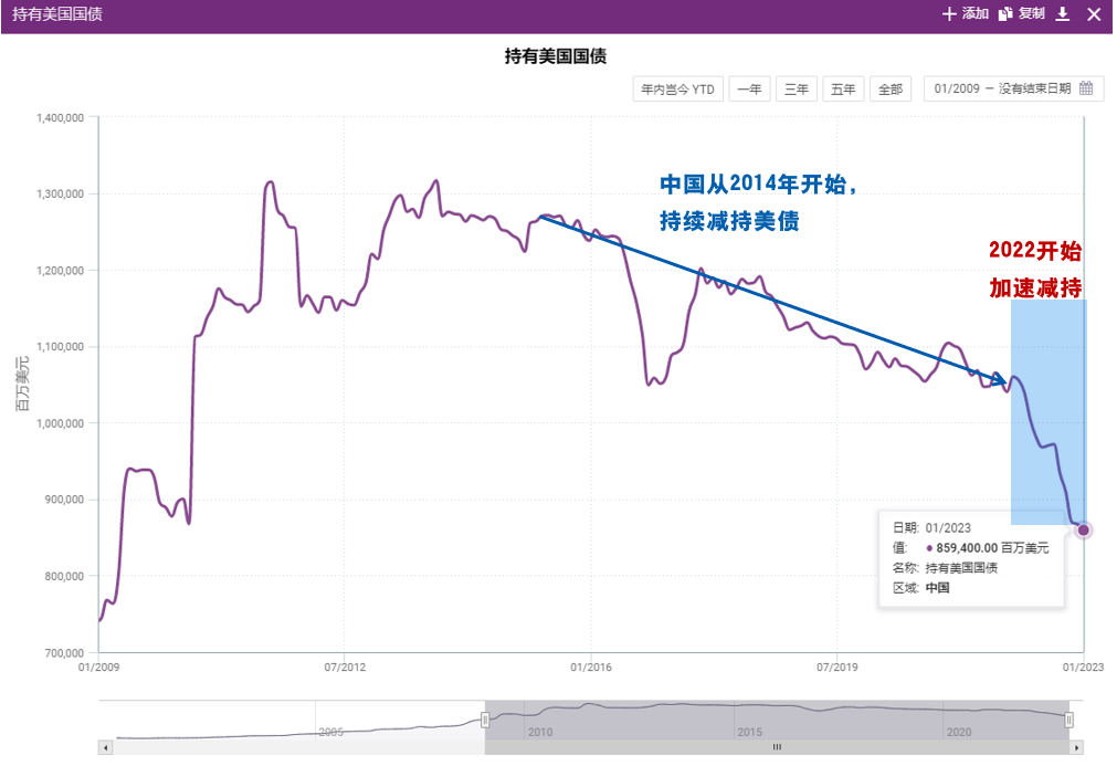 据《环球时报》3月18日消息:美国财政部本周的数据显示,今年1月在美国国债的境外持有量连续第三个月上升之际,中国的持有量从去年12月的8671亿美元降至8594亿美元,连续第6个月下降,创下2009年5月以来最低点。基于美国的数据,过去10年来中国已将美国国债减持34.1%,包括2022年减持的16.6%。大家看下面的图:中国大陆持有美债规模的历史最高点为2013年11月,达到了1.32万亿美元,然后从2014年开始就陆续减持美债,到了2022年的时候,抛售速度明显加快,目前仅剩8594亿美债。