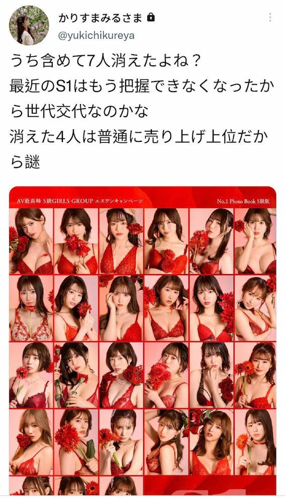 干,七个人我都凑不齐了,结果是八位女演员离开S1?我们一块儿来看看ひなたまりん(日向真凛)丢出来的那张图:那是S1在去年(2022)动员所以女演员进行的促销活动,照片上一共有27人:从第一排左至右开始算分别是ひなたまりん(日向真凛)、つばさ舞(翼舞)、坂井なるは(坂井成羽)、miru、香水じゅん(香水纯)、葵つかさ(葵司);第二排左至右分别是山手梨爱、河北彩花、三上悠亜、うんぱい(Unpai)、小仓七海、天音まひな(天音真比奈,后来改名为星まりあ);第三排由左至右则是安位カヲル(安位薰)、羽咲みはる(羽咲美晴)、奥田咲、架乃ゆら(架乃由罗)、爱宝すず(爱宝铃)、香澄りこ(香澄莉子);第四排由左至右则是小宵こなん(小宵虎南)、汐世(后来改名凪ひかる)、小岛みなみ(小岛南)、星宫一花、七ツ森りり(七森莉莉)以及东云みれい(东云美玲);最后一排由左至右则是枫ふうあ(枫富爱)、梦乃あいか(梦乃爱华)以及鹫尾めい(鹫尾芽衣)〜