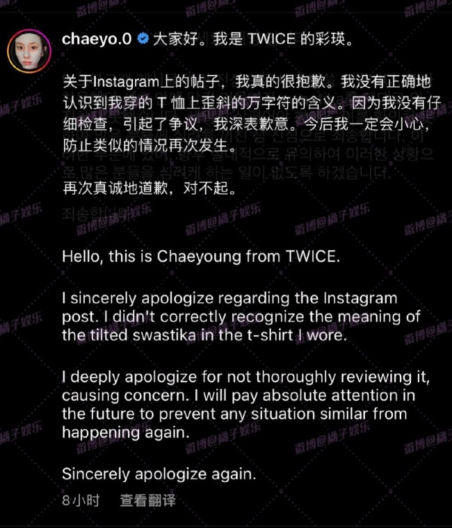 【孙彩瑛因衬衫图案发文道歉, 纳粹卐字符到底是啥】3月21日,韩国女团TWICE孙彩瑛就着装争议道歉:“我没有正确意识到我穿的t恤上的图案的含义。对于没有仔细地审查它,引发关注的行为,我感到深深地抱歉。我以后一定会绝对小心,坚决防止任何类似的情况问题再发生。”