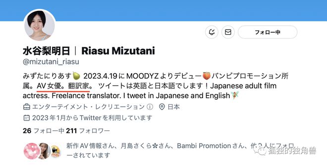 她叫「水谷梨明日」,有在关注女优的朋友这几天应该都注意到她的twitter了,只是和其他人不一样,除了注明自己是AV女优外,这位新人还说了,自己是「翻訳家(翻译家)」,会用日文和英语发文⋯