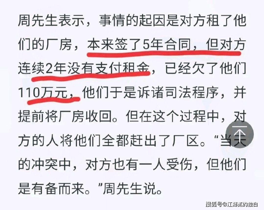 捋一捋这起冲突的起因,厂房原本签订了5年的租期,不允许私下转让给他人,可是租用的一方不仅2年未支付租金,还将厂房多次转让给他人,企业的房东无奈只能上门要回厂房。