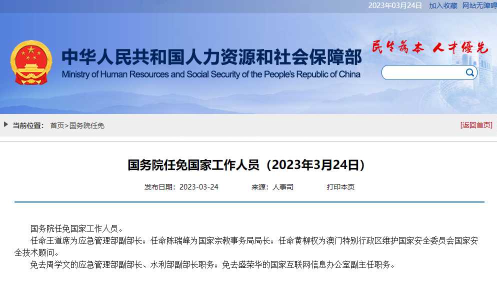 王道席任应急管理部副部长,陈瑞峰任国家宗教事务局局长